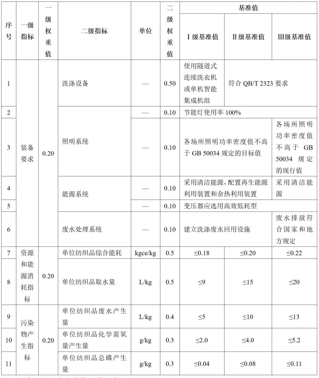 國家發(fā)改委、生態(tài)環(huán)境部、商務(wù)部于2018年12月29日頒布實(shí)施了《洗染業(yè)清潔生產(chǎn)評價指標(biāo)體系》(國家發(fā)改委 生態(tài)環(huán)境部 商務(wù)部 公告 2018年 第85號)?!吨笜?biāo)體系》適用于洗染企業(yè)的清潔生產(chǎn)審核、清潔生產(chǎn)潛力與機(jī)會的判斷以及清潔生產(chǎn)績效評定和清潔生產(chǎn)績效公告制度,也適用于環(huán)境影響評價、排污許可證管理、環(huán)保領(lǐng)跑者等環(huán)境管理制度。以公用紡織品為例,《指標(biāo)體系》部分內(nèi)容如下表所示。