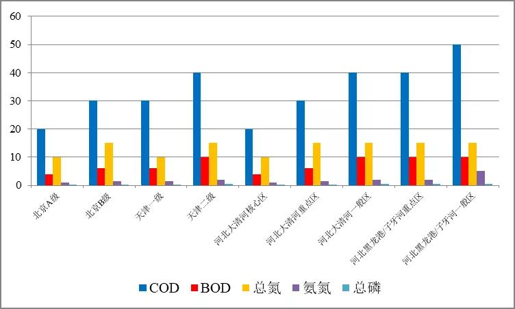 圖1 京津冀地區(qū)水污染物排放標(biāo)準(zhǔn)(直接排放)